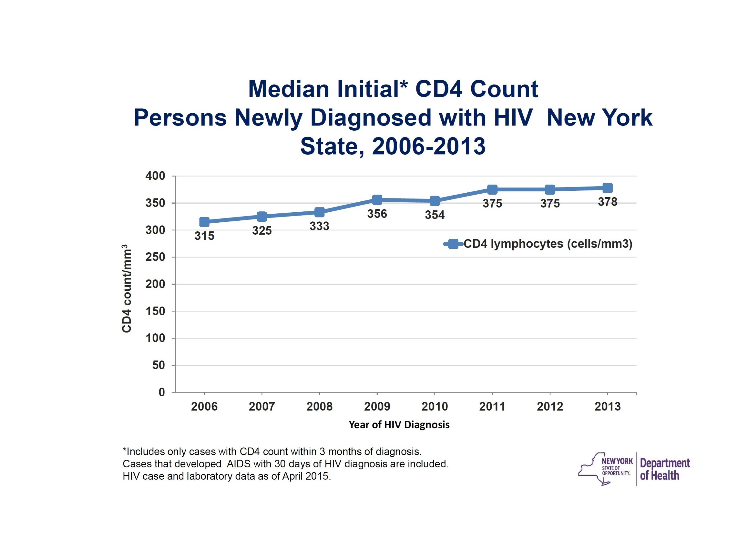 The CD4 cell count among persons with newly diagnosed HIV infection is a measure of immune deficiency and the median CD4 count among newly diagnosed persons is an important population-level indicator of the timeliness of HIV diagnosis following infection. Using HIV Surveillance Registry data, New York State monitors trends in the median CD4 count among persons with newly diagnosed HIV. The graph below shows a steady increase in the median CD4 count among persons with newly diagnosed HIV in New York who had a CD4 count within 3 months of their diagnosis, from 315 cells/mm3 in 2006 to 378 cells/mm3 in 2013.