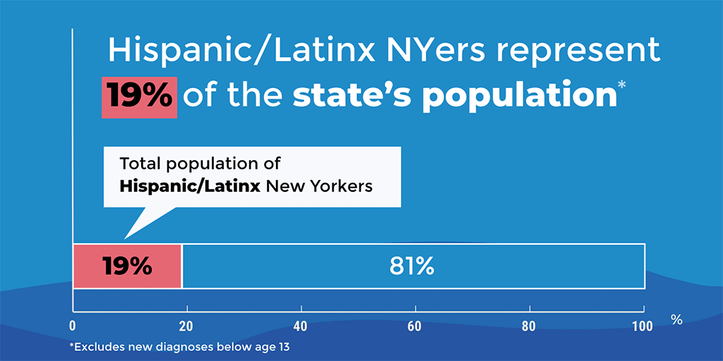 Hispanic and Latinx New Yorkers continue to be disproportionately affected by HIV. In 2023, they represented 37% (926 of 2,515) of all new HIV diagnoses in New York State, despite making up only 19% of the state’s population.