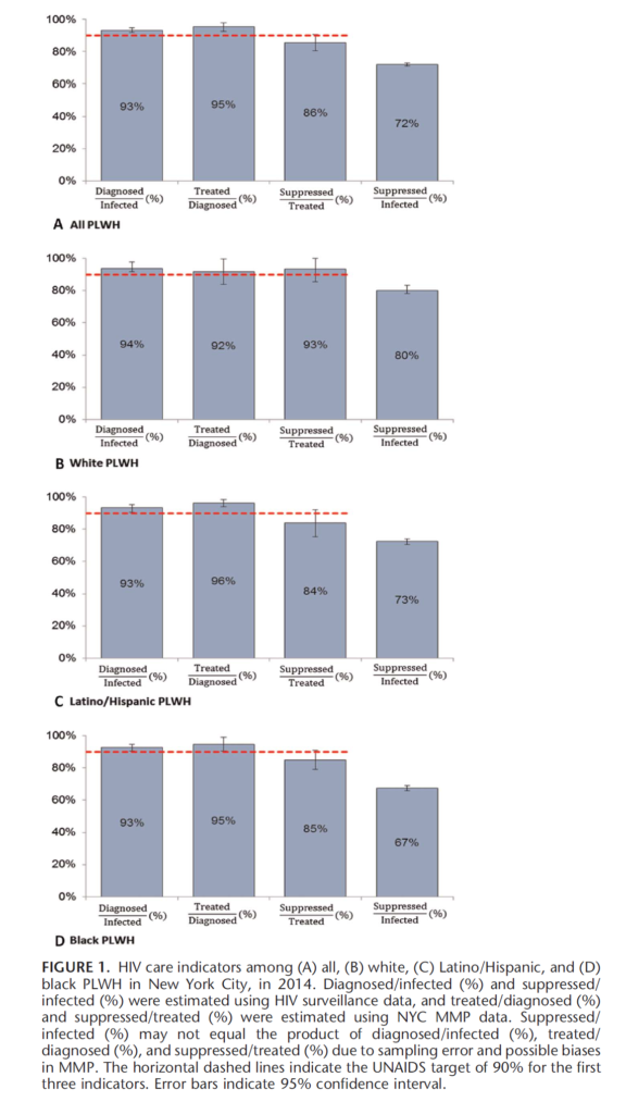A recent publication by the New York City Department of Health and Mental Hygiene (NYC DOHMH) Bureau of HIV Prevention and Control examined data from the NYC HIV registry and NYC Medical Monitoring Project and found that New York City had achieved the 1st and 2nd UNAIDS 90% targets for awareness of HIV status and receipt of ART (93% and 95%, respectively), but fell short of the viral suppression goal, with a total of 86% of persons virally suppressed among those receiving ART in NYC. Despite the achievement of meeting two out of three UNAIDS goals, ongoing racial disparities were pronounced. While whites achieved all three targets, Latino/Hispanics and blacks only met the first two, with both groups remaining under 90% viral suppression (84% and 85%, respectively).